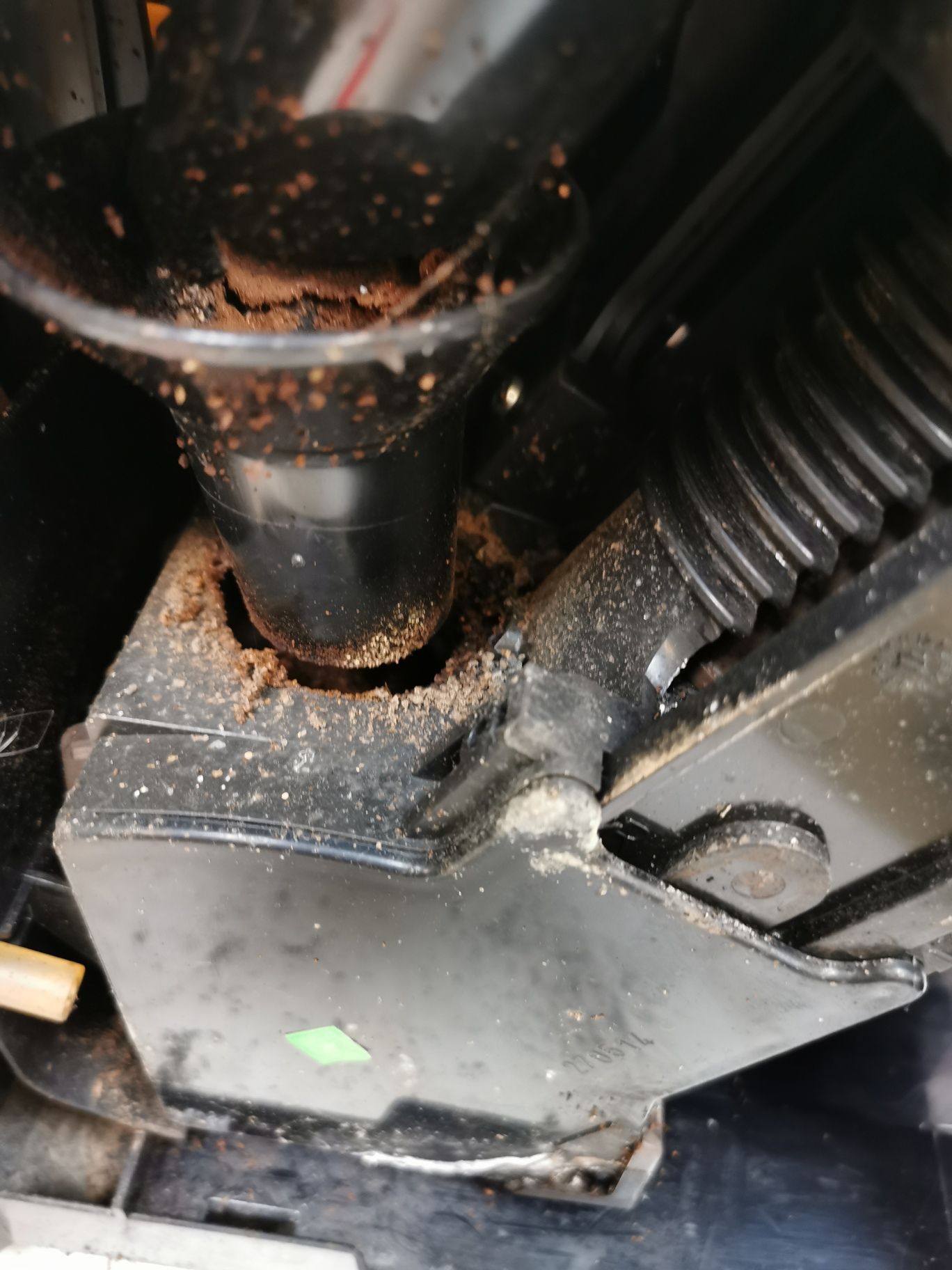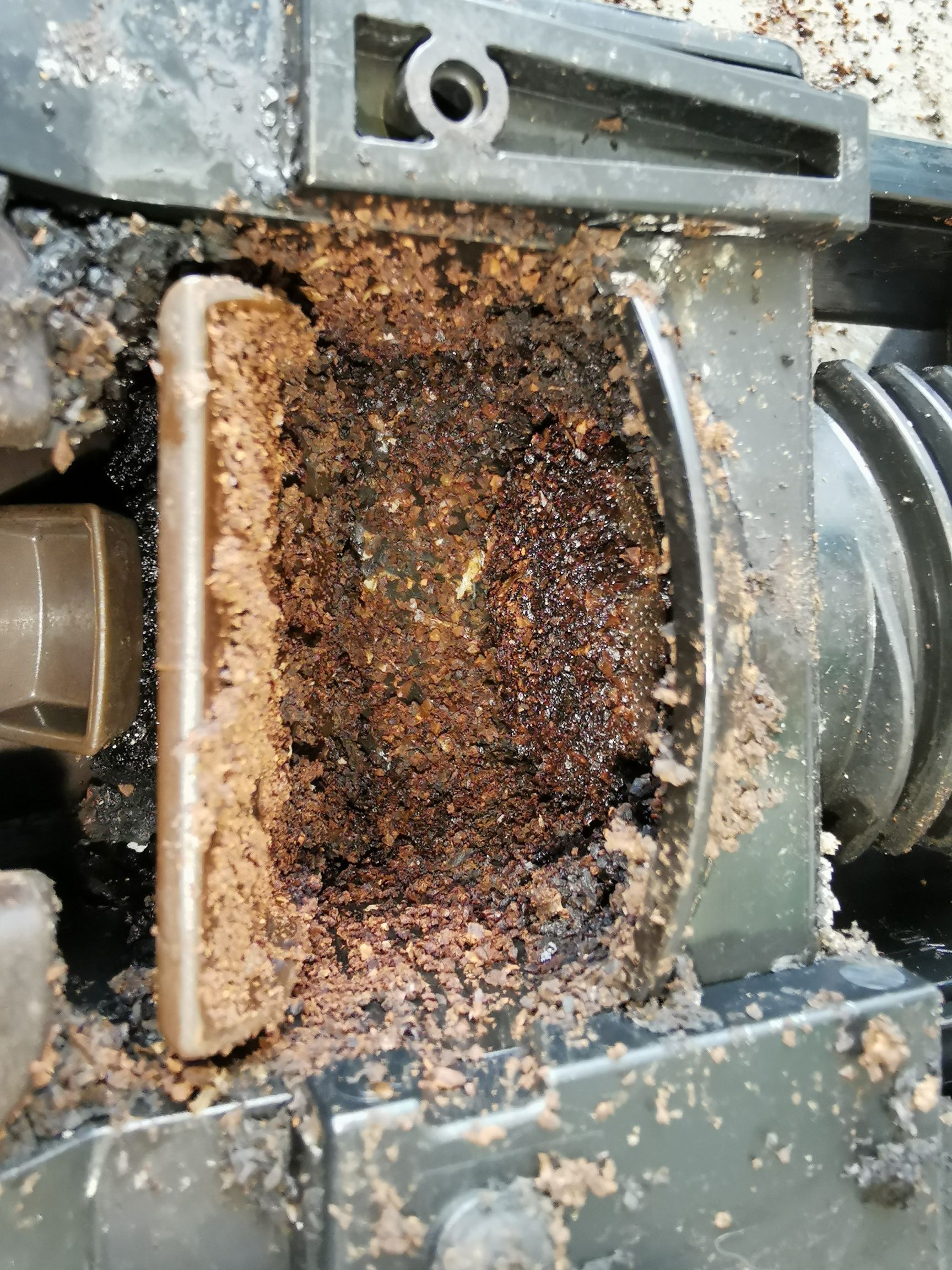 Dass bei einem Kaffeevollautomaten immer ein wenig gemahlener Kaffee in den Innenraum gelangt, ist normal. Bei dem in den Bildern gezeigten Modell (Jura ENA Micro9) ist das so leider bauartbeding noch etwas schlimmer. Hier ist zwischen Brühgruppe und Einfüllstutzen einfach zu viel Platz, wo sich das Kaffeemehl in der Maschine ausbreiten kann. Deshalb sollen Kaffeevollautomaten ja auch alle ein bis zwei Jahre in eine Werkstatt zur Wartung gebracht werden.